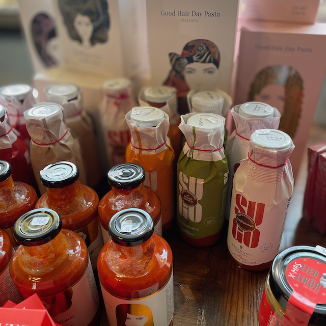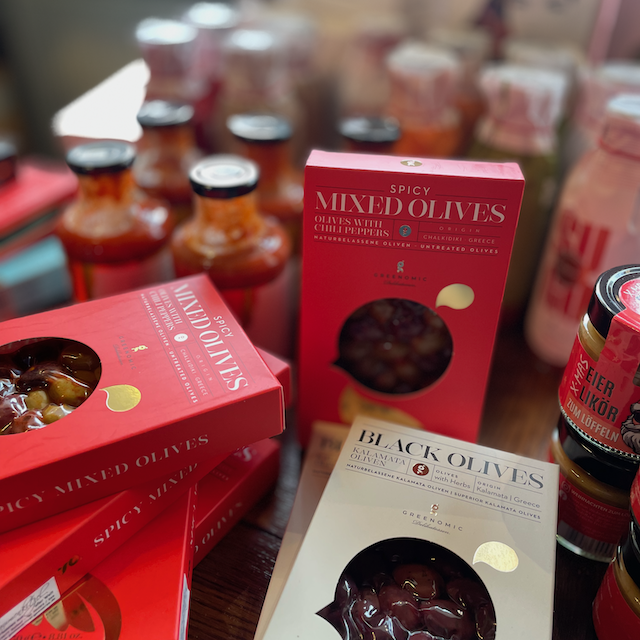 Oliven, getrocknete Tomaten, Olivenpaste, Pesto, Sugo sowie verschiedene Senf-Spezialitäten.