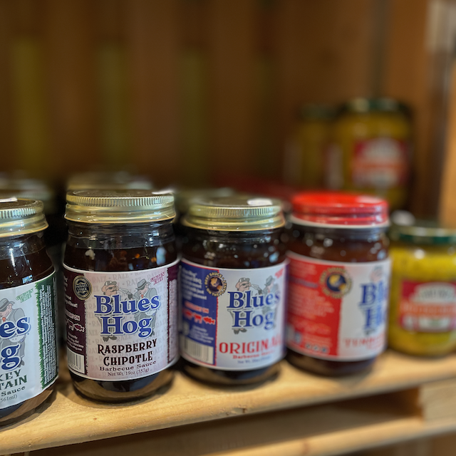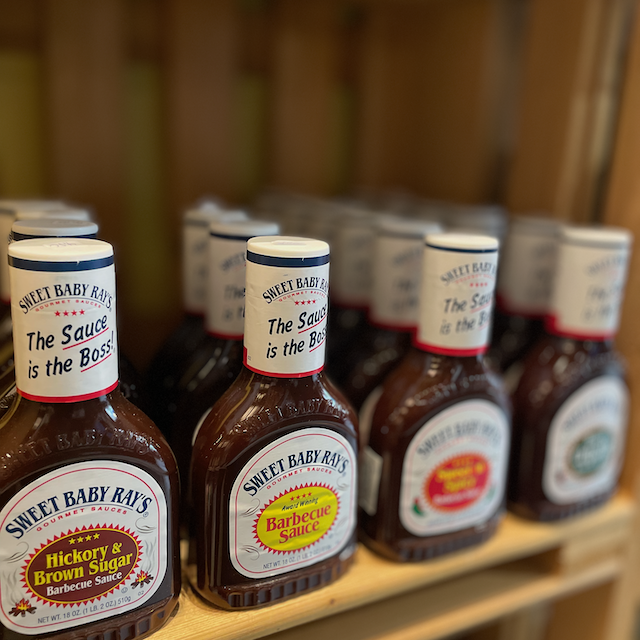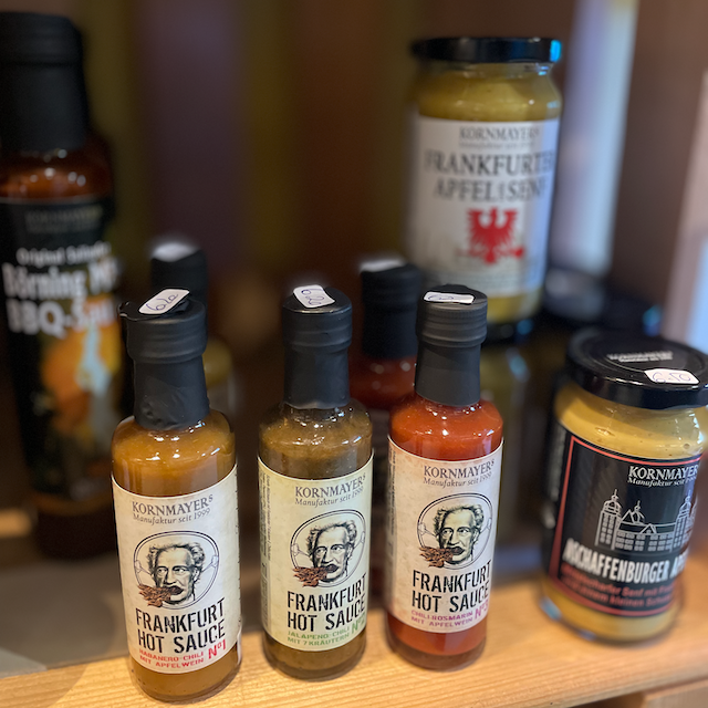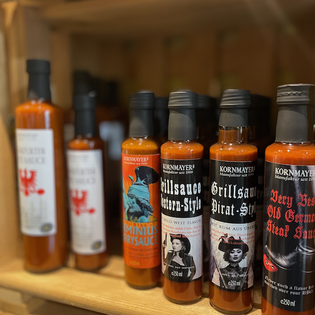 Blues Hog und Sweet Baby Rays BBQ Saucen und eine große Auswahl an Kornmayer’s Saucen aus der Region – inkl. des Klassikers „Frankfurter Rote Sauce“ und der original Sailaufer „Börning Män“ Saucen.